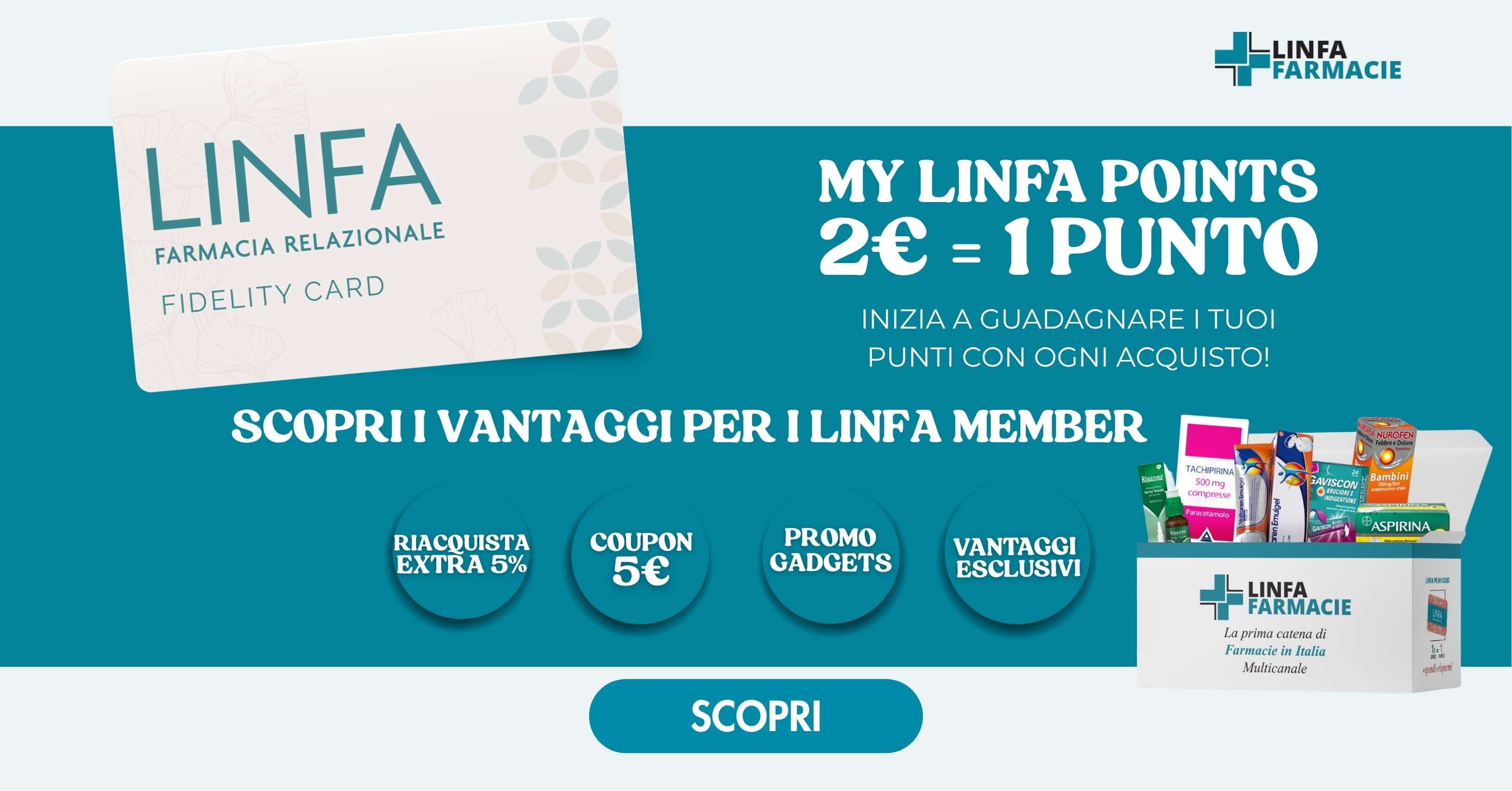Registrati su linfafarmacie.it ed ottieni Linfa Prime Card, la card virtuale totalmente gratuita. Per ogni 2,00€ spesi riceverai 1 punto; al raggiungimento di 120 punti avrai un coupon sconto di 5,00€ da usare sui tuoi acquisti successivi.