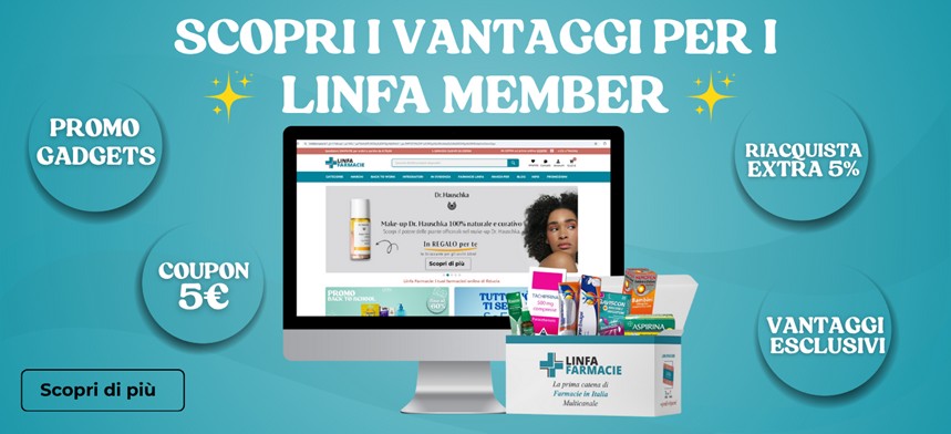 Linfa Farmacie è la tua farmacia online di fiducia. Ci prendiamo cura della tua salute e del tuo benessere. Più di 80.000 farmaci online sono disponibili sul nostro shop. Acquista in tutta tranquillità medicinali, integratori, parafarmaci, rimedi, presidi medicali, prodotti per il personal care e la cura degli animali. Siamo una farmacia autorizzata dal Ministero della Salute a poter commercializzare online i medicinali. Inoltre, a partire da 79€ le spese di spedizione sono gratuite. Gli specialisti di Linfa offrono un’assistenza telefonica efficiente rispondendo tutti i giorni allo 02 2137216 dal lunedì al sabato, dalle 09:00 alle 12:00 e dalle 16:00 alle 19:00. Acquistare farmaci online su LinfaFarmacie.it conviene!