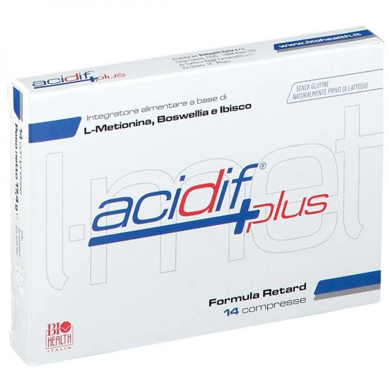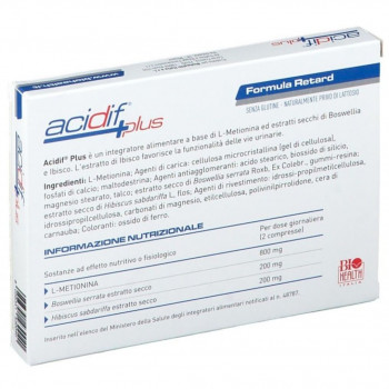 Integratore alimentare a base di L-metionina, di estratto secco di fiori di Ibiscus sabdariffa (UTIROSE - Burgundy) e di estratto secco di foglie di Boswellia serrata (AKBAMAX) titolato al 10 % in acidi acetil cheto beta boswellici (AKBA). Grazie ai suoi componenti, aiuta a favorire la corretta funzionalità dell’apparato urinario, creando condizioni sfavorevoli allo sviluppo e alla proliferazione batterica. Acidif plus si presenta in compresse retard gastroprotette a cessione graduale. Ciò ottimizza la tollerabilità e garantisce un rilascio costante nel tempo dei suoi componenti.