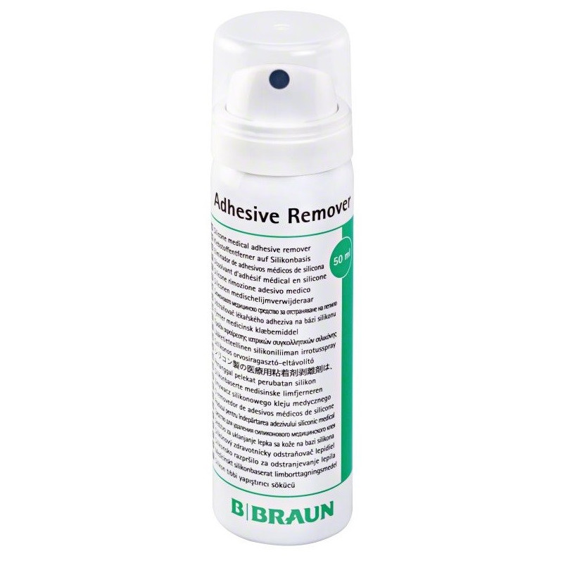 Soluzione spray per la rimozione delicata e indolore di presidi per stomia o incontinenza e medicazioni adesive dalla superfice cutanea.