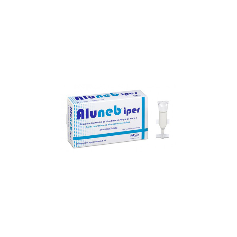 Aluneb iper è una soluzione salina ipertonica al 3% da nebulizzare mediante aerosol e doccia nasale, a base di acido ialuronico ad alto peso molecolare e xilitolo con azione decongestionante e fluidificante sulle mucose nasali. Particolarmente indicato per la pulizia delle fosse nasali soprattutto in caso di raffreddori, riniti allergiche, sinusiti e tutti gli stati di congestione delle mucose nasali. Per aerosol terapia. L'acido ialuronico nebulizzato idrata e facilita la rimozione di muco e allergeni dalle alte vie respiratorie. Può risultare utile nel coadiuvare la regolazione della clearance mucociliare alleviando tutti quei sintomi legati a fattori infiammatori, allergenici e ambientali. Libera il naso dal muco favorendo l'eliminazione delle eccessive secrezioni nasali. Affezioni rinofaringee caratterizzate da congestione ed alterazione della clerance mucociliare. Idrata le vie respiratore e stimola la clerance mucociliare. Facilita la respirazione, la poppata e il sonno dei lattanti. In aerosol terapia può essere utilizzato per diluire i farmaci.
