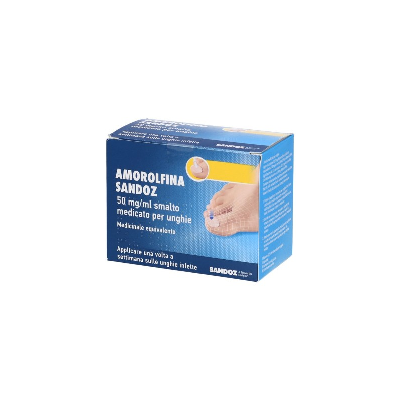 Posologia Lo smalto per unghie deve essere applicato sulle unghie interessate delle dita della mano o del piede una volta alla settimana. Metodo di somministrazione Per uso topico. Da applicarsi sulle unghie interessate. 1. Prima di ogni applicazione, limare l’area dell’unghia malata (in particolare la superficie dell’unghia) il più accuratamente possibile con una limetta per unghie in dotazione nella confezione. La superficie dell’unghia deve essere pulita e sgrassata utilizzando uno dei tamponi imbevuto di solvente per smalto (in dotazione nella confezione). Prima di ripetere la successiva applicazione di Amorolfina Sandoz smalto medicato per unghie, questo processo di limatura e pulizia deve essere ripetuto, in modo da rimuovere lo smalto residuo esistente. Attenzione! Le limette per unghie utilizzate per il trattamento non devono essere utilizzate per le unghie sane .2. Con una spatola in dotazione, applicare lo smalto su tutta la superficie dell’unghia malata e lasciare asciugare. Per ogni unghia da trattare, immergere la spatola nello smalto. Attenzione! La spatola non deve essere strofinata sul bordo del flacone . Dopo l'uso, pulire la spatola con il tampone imbevuto di solvente per smalto. Dopo l’applicazione di Amorolfina Sandoz smalto medicato per unghie, deve essere rispettato un intervallo di almeno 10 minuti prima dell’applicazione di uno smalto cosmetico. È importante lavarsi le mani dopo aver applicato Amorolfina Sandoz smalto medicato per unghie. Se Amorolfina Sandoz smalto medicato per unghie è applicato sulle dita della mano, i pazienti devono aspettare che queste siano asciutte prima di lavarsi le mani. Durata del trattamento Il trattamento deve essere continuato senza interruzioni fino a quando l'unghia si è rigenerata e la zona colpita è completamente guarita. In generale occorrono 6 mesi di terapia per le unghie delle mani e da 9 a 12 mesi per le unghie dei piedi (la durata del trattamento dipende essenzialmente dall'intensità, dalla localizzazione ed estensione dell'infezione). Dopo un trattamento di 3 mesi senza risultati, consultare il medico. Popolazione pediatrica A causa della mancanza di esperienza clinica, bambini ed adolescenti non devono essere trattati con Amorolfina Sandoz smalto medicato per unghie. Anziani Non vi sono raccomandazioni di dosaggio specifiche per l’uso nei pazienti anziani.