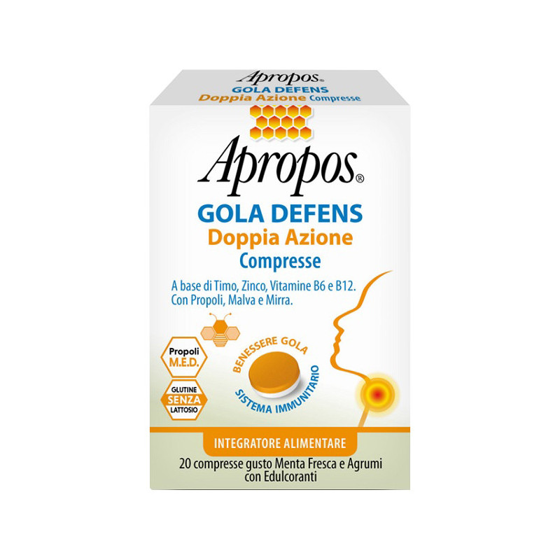 Ingredienti Agenti di carica: sorbitolo, xilitolo; aromi, Propoli e.s. tit. 12 % polifenoli (Propolis, resina); stabilizzante: idrossi-propil-metilcellulosa; malva polvere (Malva sylvestris L., foglie); timo e.i.a. (Thymus vulgaris, foglie); acidificante: acido citrico; mirra e.s. [Commiphora myrrha (Nees) Engl. (syn. C. molmol, oleum gum resin)]; agenti antiagglomeranti: sali di magnesio degli acidi grassi, carbossimetilcellulosa sodica reticolata; zinco L-pidolato (Pido-Zinc); amido di mais; coloranti: ossidi di fero; maltodestrine; edulcoranti: acesulfame K, sucralosio; vitamina B12 (cianocobalamina), vitamina B6 (cloridrato di piridossina), concentrato colorante di cartamo.