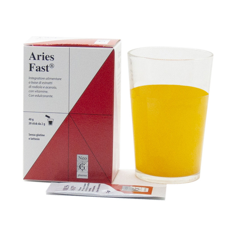 Descrizione Aries Fast® è un integratore alimentare a base di Rhodiola rosea L, Malpighia punicifolia L, vitamina B2, vitamina B6, vitamina B12, niacina, acido folico, acido pantotenico viamina D vitamina E. La Rhodiola rosea ha effetto tonico-adattogeno, effetto tonico per la stanchezza fisica e mentale e favorisce il mantenimento del normale tono dell'umore. La Malpighia punicifolia (Acerola) favorisce le naturali difese dell'organismo ed ha azione di sostegno, ricostituente e effetto antiossidante. La vitamina B2, la vitamina B6, la vitamina B12, la niacina, l’acido folico e l’acido pantotenico contribuiscono alla riduzione della stanchezza e dell'affaticamento. La vitamina E contribuisce alla protezione delle cellule dallo stress ossidativo. La vitamina D che contribuisce alla normale funzione del sistema immunitario negli adulti e nei bambini.