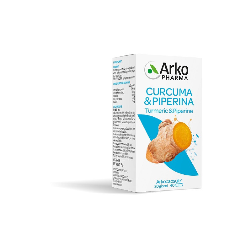 Ingredienti Polvere ed estratto di rizoma di curcuma (Curcuma longa L.); agente di carica: gomma di acacia; estratto di pepe nero (Piper nigrum L.). Capsula 100% vegetale: idrossipropilmetilcellulosa.