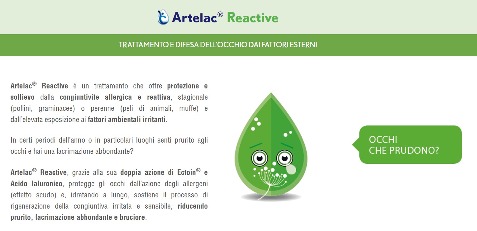 Artelac Reactive contribuisce a ridurre prurito, lacrimazione eccessiva, rossore, irritazione agli occhi.