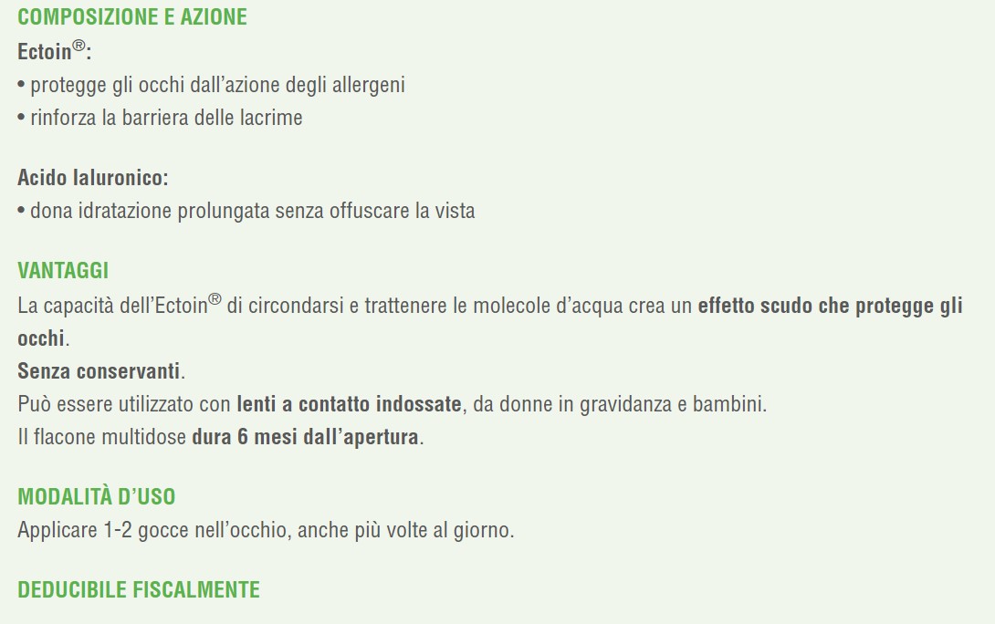 Contiene una molecola (Ectoin) che protegge l'occhio dalle sostanze irritanti (effetto scudo), e acido ialuronico, che dona sollievo, idratando a lungo.