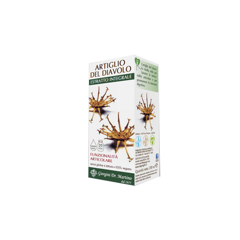 Descrizione Integratore alimentare a base di estratto vegetale di artiglio del diavolo. L'artiglio del diavolo risulta utile per favorire la funzionalità articolare e per promuovere la funzione digestiva. L'estratto integrale del Dr. Giorgini consiste in un estratto concentrato contenente l'intero fitocomplesso della pianta. L'efficacia e la qualità del prodotto sono garantite dall'estrazione sottovuoto e a bassa temperatura che permette di preservare integri tutti i principi attivi e nutritivi della pianta (fitocomplesso). L'eventuale presenza di resine e oli essenziali in superficie e/o di sedimento sul fondo del prodotto sono garanzia di qualità. Infatti essi costituiscono le frazioni insolubili del fitocomplesso. Per questo motivo si raccomanda di agitare ogni volta prima dell'uso. 100% vegano.
