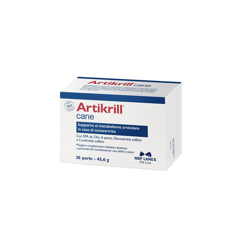 Artikrill cane è un mangime complementare dietetico formulato con acidi grassi omega-3 (EPA) da olio di pesce e con un livello adeguato di vitamina E per il supporto del metabolismo articolare in caso di osteoartrite del cane.