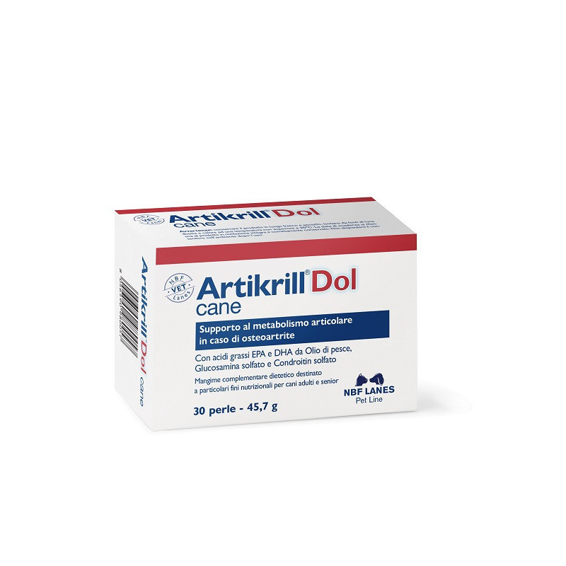 Descrizione Artikrill Dol cane è un mangime complementare dietetico formulato con acidi grassi omega-3 (EPA) da olio di pesce e con un livello adeguato di vitamina E per il supporto del metabolismo articolare in caso di osteoartrite del cane.