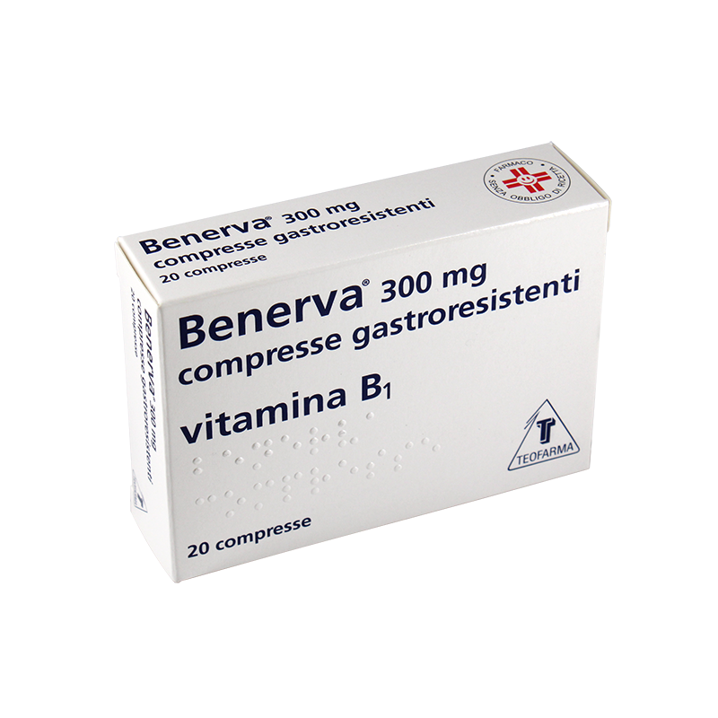 Benerva 300 mg compresse gastroresistenti. Una compressa contiene: tiamina cloridrato (vitamina B1) 300 mg. Benerva 100 mg/1 ml soluzione iniettabile per uso intramuscolare. Una fiala da 1 ml contiene: tiamina cloridrato (vitamina B1) 100 mg. Per l’elenco completo degli eccipienti, vedere 6.1.