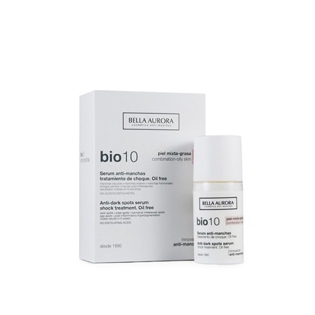 Bio10 Serum anti-macchie per pelle mista-grassa è il prodotto più efficace di Bella Aurora per combattere le macchie cutanee di melanina e lipofuscina, sia diffuse che localizzate, con la maggiore concentrazione di agenti depigmentanti. Depigmenta efficacemente grazie all'elevata concentrazione di esclusivi ingredienti che attuano ognuno dei 7 meccanismi del processo della depigmentazione cutanea. Riduce ed elimina tutte le macchie esistenti, prevenendo l'apparizione di nuove. Tratta le macchie di melanina e lipofuscina, come gli arrossamenti e i segni post-infiammatori. Una texture leggera e ultra soave, seboregolatrice, che si fonde con la pelle in pochi secondi, lasciandola opaca e senza luminosità.