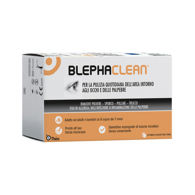 Descrizione Dispositivo medico. Garza sterile, impregnata con una lozione per l’igiene giornaliera delle palpebre. Indicata specialmente: - in caso di sensibilità della pelle, palpebre o occhi; - per rimuovere polvere, polline e secrezioni palpebrali; - in caso di infiammazione o infezione delle palpebre come blefariti, disfunzione delle ghiandole di Meibomio, orzaiolo o calazio; - per pulire le palpebre prima di procedure oftalmiche come iniezioni terapeutiche nell’occhio (iniezioni intra vitreali), chirurgia laser refrattiva (LASIK o PRK) e intervento di cataratta. BLEPHACLEAN può essere utilizzato anche dopo intervento, sotto il controllo del medico o dell’oftalmologo. BLEPHACLEAN rispetta il contorno occhi e la flora batterica presente. Il prodotto è stato testato sotto controllo oftalmologico. Dermatologicamente testato.