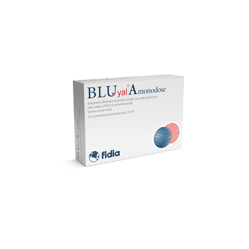 Descrizione Soluzione oftalmica isotonica sterile con acido ialuronico sale sodico (FHA 1.0) ed aminoacidi, senza conservanti, utile all’integrazione della secrezione lacrimale e al ripristino delle condizioni fisiologiche del film lacrimale. BLUyal A monodose protegge e lubrifica la superficie dell’occhio procurando un sollievo ai disturbi causati da stress meccanico, ambientale e visivo. L’acido ialuronico è un mucopolisaccaride fisiologicamente presente nell’occhio umano e ha proprietà di aderire alla superficie oculare proteggendola e lubrificandola. Per le sue caratteristiche mucoadesive permane a lungo sulla superficie dell’occhio e stabilizza il film lacrimale. La formulazione con aminoacidi contribuisce alla lubrificazione della superficie oculare e a migliorare la protezione degli epiteli sottoposti a stress di varia natura. Indicato per l’idratazione e la lubrificazione della superficie oculare.