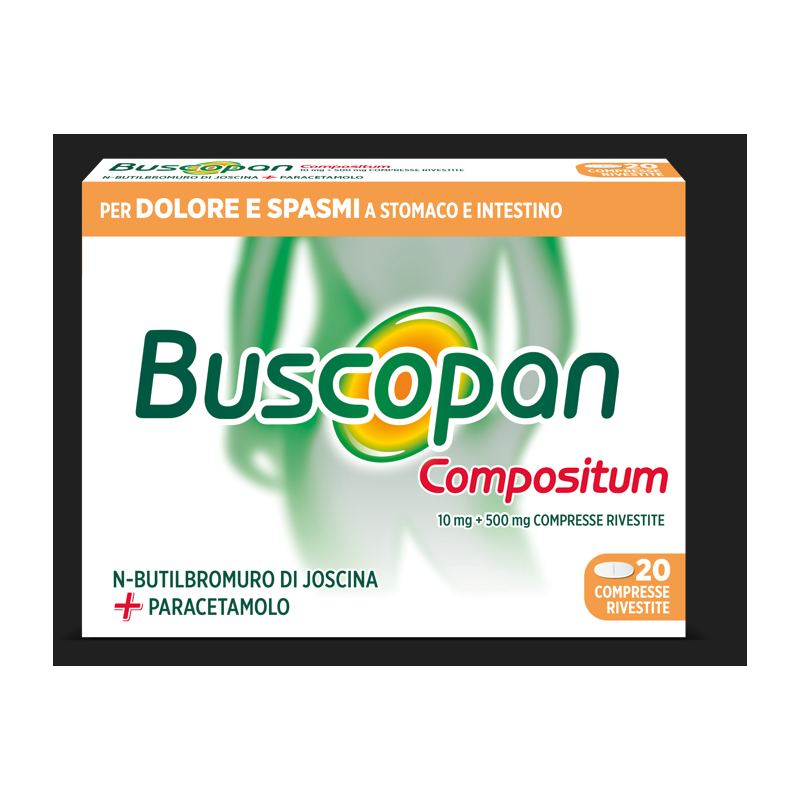 Buscopan Compositum non deve essere assunto per più di 3 giorni se non indicato dal medico. Invitare il paziente a rivolgersi al medico se il dolore persiste o peggiora, se si verificano nuovi sintomi, o se insorge rossore o gonfiore perché questi potrebbero essere sintomi di una grave condizione. Nel caso di dolore addominale grave di origine sconosciuta che persista, peggiori o sia accompagnato da sintomi quali febbre, nausea, vomito, alterazione dei movimenti intestinali, addome disteso, calo della pressione arteriosa, svenimento o sangue nelle feci, rivolgersi immediatamente al medico. Per prevenire il sovradosaggio, ci si deve assicurare che altri farmaci eventualmente assunti contemporaneamente non contengano paracetamolo, uno dei principi attivi di Buscopan Compositum. Può insorgere danno epatico se il dosaggio raccomandato per paracetamolo è superato (vedere il paragrafo 4.9). Buscopan Compositum deve essere usato con cautela in caso di: • insufficienza da glucosio-6-fosfato deidrogenasi; • disfunzione epatica (es. a causa dell’abuso cronico di alcol, epatiti); • uso cronico di alcol anche in caso di recente cessazione;• funzione renale compromessa; • sindrome di Gilbert; • insufficienza epatocellulare da lieve a moderata (Child - Pugh A/B); • basse riserve di glutatione. Somministrare con cautela nei soggetti con insufficienza renale od epatica. In tali condizioni Buscopan Compositum deve essere somministrato solo sotto controllo medico, se necessario, riducendo la dose o prolungando l'intervallo tra le singole somministrazioni. La conta ematica e la funzionalità renale ed epatica devono essere monitorate dopo l’uso prolungato. Il largo uso di analgesici, specialmente ad alte dosi, può indurre cefalea che non deve essere trattata con dosi aumentate di medicinale. Gravi reazioni di ipersensibilità acuta (es. shock anafilattico) sono osservate molto raramente. Il trattamento deve essere sospeso ai primi segni di una reazione di ipersensibilità in seguito alla somministrazione di Buscopan Compositum. Gravi reazioni cutanee: con l’uso di Buscopan Compositum sono state riportate reazioni potenzialmente fatali come la sindrome di Stevens-Johnson (SSJ) e la necrolisi epidermica tossica (NET). I pazienti devono essere informati circa i segni ed i sintomi e monitorati attentamente per le reazioni cutanee. Se si verificano i sintomi o i segni della sindrome di Stevens-Johnson, della necrolisi epidermica tossica (ad esempio eruzione cutanea progressiva associata a vesciche o lesioni delle mucose), il paziente deve sospendere immediatamente il trattamento con Buscopan Compositum e consultare un medico. Si può verificare epatotossicità con paracetamolo anche a dosi terapeutiche, dopo un trattamento di breve durata e in pazienti senza disfunzione epatica pre-esistente (vedere il paragrafo 4.8). Una brusca interruzione degli analgesici dopo un uso prolungato ad alte dosi può causare sintomi da astinenza (es. cefalea, stanchezza, nervosismo), che solitamente si risolvono entro pochi giorni. La riassunzione di analgesici deve essere subordinata al consiglio medico, e alla remissione dei sintomi da astinenza. A causa del potenziale rischio di complicazioni anticolinergiche, si deve usare con cautela nei pazienti predisposti al glaucoma ad angolo chiuso, nei pazienti soggetti ad ostruzioni delle vie intestinali o urinarie ed in quelli inclini alla tachiaritmia con turbe del sistema nervoso centrale autonomo, nelle tachiaritmie, nell’ipertensione arteriosa, nell’insufficienza cardiaca congestizia e nell’ipertiroidismo. Tutti gli antimuscarinici riducono il volume delle secrezioni bronchiali; pertanto essi debbono essere impiegati con cautela nei soggetti con affezioni infiammatorie croniche ostruttive dell’apparato respiratorio. Durante il trattamento con paracetamolo prima di assumere qualsiasi altro farmaco controllare che non contenga lo stesso principio attivo, poiché se il paracetamolo è assunto in dosi elevate si possono verificare gravi reazioni avverse, vedere paragrafo 4.2. Invitare il paziente a contattare il medico prima di associare qualsiasi altro farmaco. Vedere anche il paragrafo 4.5. Buscopan Compositum 10 mg + 500 mg compresse contiene 4,32 mg di sodio per compressa, cioè meno di 1mmole (23 mg) di sodio, quindi è essenzialmente “senza sodio”.