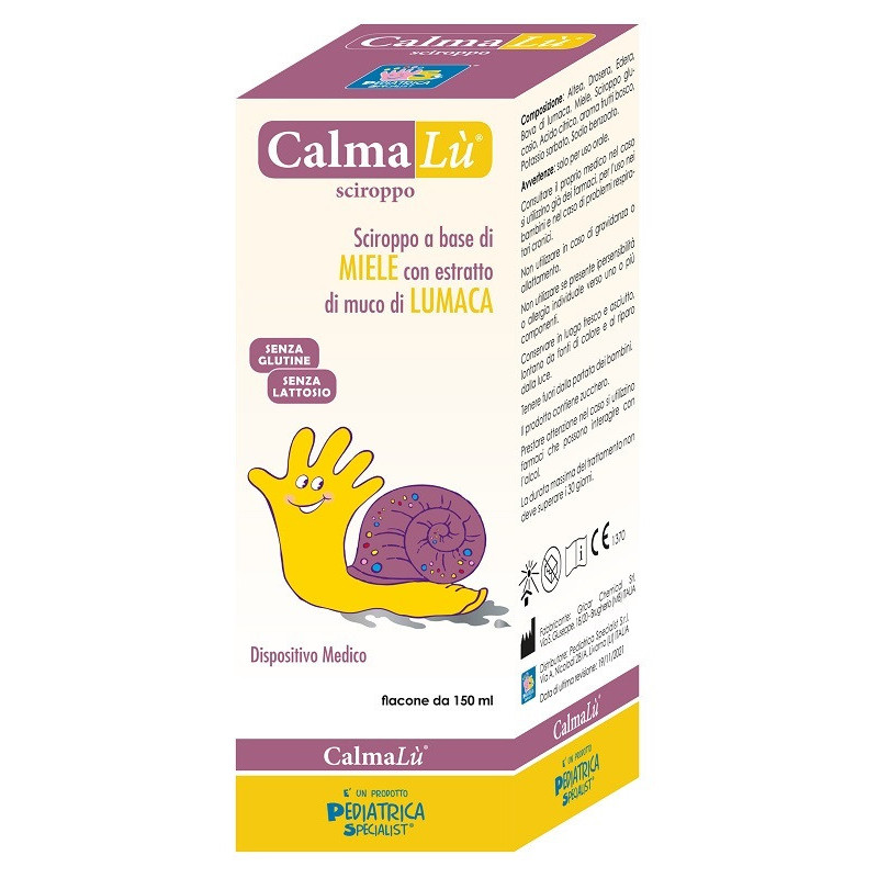 Descrizione Dispositivo Medico Classe I. Non sterile. Contiene altea, drosera, edera, bava di lumaca. Questi componenti formano un film protettivo ad "effetto barriera" che calma la tosse proteggendo le prime vie aeree; è specificatamente formulato per aderire alla mucosa e limitarne il contatto con agenti esterni irritanti; promuove inoltre l'idratazione della mucosa e del muco favorendo l'espulsione del muco in eccesso. CalmaLù sciroppo protegge la mucosa, calma l'irritazione, idrata e favorisce l'eliminazione del muco attraverso il seguente meccanismo di azione: effetto barriera, azione mucoregolatrice, azione lubrificante. Indicato per il trattamento della tosse, sia secca che grassa, ai bambini a partire da tre anni di età.