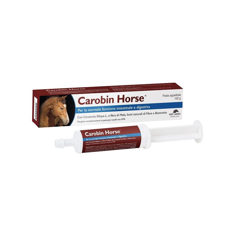 Descrizione Mangime complementare dietetico in pasta per cavalli non DPA destinato a particolari fini nutrizionali. Carobin Horse pasta appetibile da 100 g, grazie al contenuto di sostanze adsorbenti, permette di ridurre la sintomatologia correlata a sindromi diarroiche. Carobin Horse apporta fibre vegetali utili per favorire la compensazione di affezioni digestive croniche dell'intestino crasso nel cavallo. Contiene Ceratonia siliqua L. e fibra di mela, fonti naturali di fibre e bentonite.