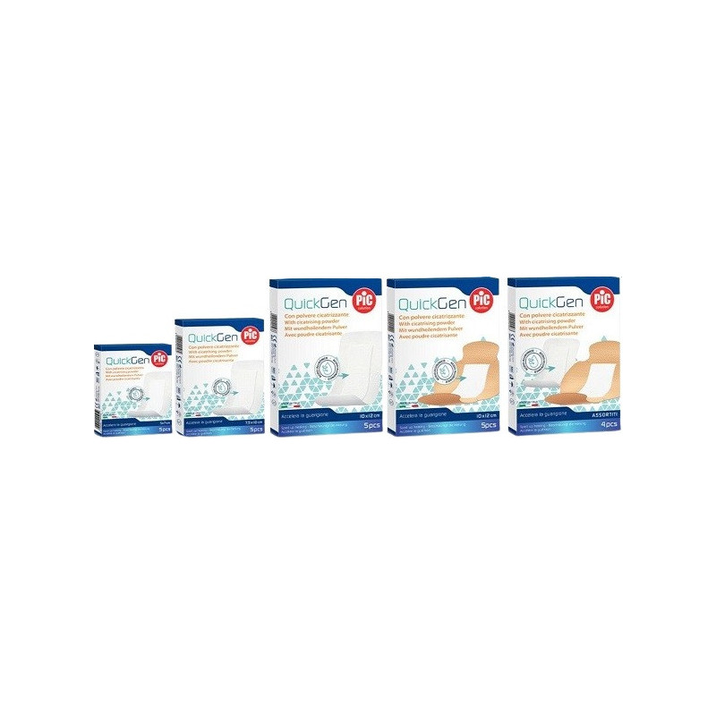 Descrizione È un cerotto Pic con acido ialuronico che aiuta la cute a rigenerarsi velocemente e quindi a cicatrizzare prima. Protegge la ferita e ne accelera il processo di guarigione grazie all'acido ialuronico contenuto nel tampone. QuickGen è consigliato in caso di escoriazioni, abrasioni e scottature con essudato. L'azione dell'acido ialuronico crea un film protettivo stabile sopra alla ferita che rimane cosi, sempre protetta e ben idratata: queste tre caratteristiche permettono alla pelle di rigenerarsi prima, e alla ferita di guarire velocemente. Il supporto adesivo in tessuto-non tessuto permette alla pelle di respirare, inoltre il formato "a farfalla" per articolazioni consente a gomiti e ginocchia elevata mobilità - grazie al supporto elastico e ai bordi ergonomici. QuickGen è presente in 4 referenze con dimensioni e forme diverse (tra cui la pratica shape a farfalla per articolazioni), piu una versione mix con una referenza per tipo: così puoi prenderti cura di ogni ferita nel modo più adatto.