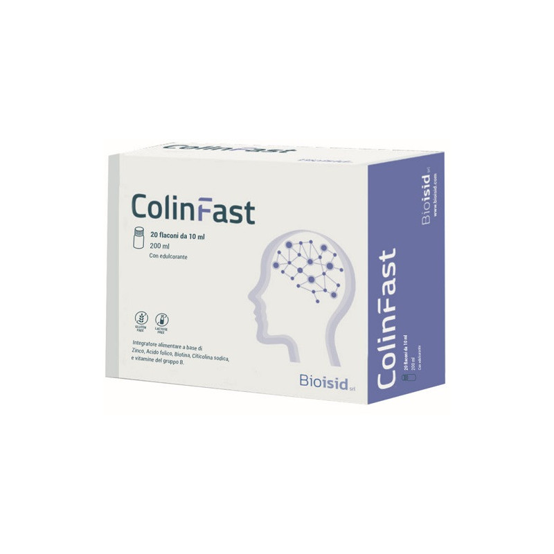 Descrizione Integratore alimentare a base di zinco, acido folico, biotina, citicolina sodica, colina bitartrato e vitamine del gruppo B. La vitamina B5 contribuisce al normale metabolismo energetico, alla riduzione della stanchezza e dell’affaticamento e a prestazioni mentali normali. La vitamina B2 contribuisce al normale metabolismo energetico e al normale funzionamento del sistema nervoso, al mantenimento di membrane mucose normali e alla riduzione della stanchezza e dell’affaticamento. Il folato contribuisce alla normale funzione psicologica. Inoltre contribuisce alla normale funzione del sistema immunitario e alla riduzione della stanchezza e dell’affaticamento. La vitamina B6 e la Biotina contribuiscono al normale metabolismo energetico, al normale funzionamento del sistema nervoso e alla normale funzione psicologica. Inoltre la vitamina B6 contribuisce alla normale funzione del sistema immunitario e alla riduzione della stanchezza e dell'affaticamento. La vitamina B1 contribuisce al normale metabolismo energetico, al normale funzionamento del sistema nervoso, alla normale funzione psicologica e alla normale funzione cardiaca. Lo Zinco contribuisce alla normale funzione cognitiva, alla normale funzione del sistema immunitario e alla protezione delle cellule dallo stress ossidativo.