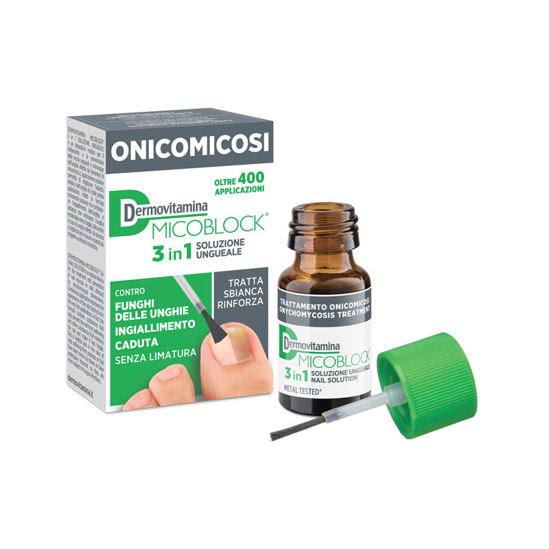 Per la prevenzione si consiglia di applicare il prodotto sull’unghia affetta da micosi e anche sulle unghie vicine. - Per il primo mese: applicare il prodotto 2 volte al giorno. - Per i mesi successivi e fino alla completa ricrescita dell’unghia sana: applicare il prodotto 1 volta al giorno, evitando di bagnare l’unghia interessata per almeno un’ora dopo l’applicazione. DERMOVITAMINA MICOBLOCK 3 in 1 ONICOMICOSI SOLUZIONE UNGUEALE non è uno smalto. Se lo si desidera, è possibile applicare sul suo film protettivo uno smalto cosmetico (dopo almeno un’ora dall’applicazione). Prima di riapplicare rimuovere eventuali smalti cosmetici per consentire la penetrazione del prodotto. È necessario protrarre il trattamento delle unghie colpite per diversi mesi consecutivi, per consentire la fisiologica ricrescita dell’unghia sana, eliminando la parte danneggiata. Se i sintomi persistono e non sono visibili miglioramenti alla ricrescita dell’unghia consultare il proprio medico.