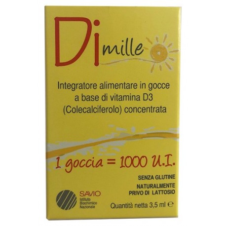 Dimille è un integratore alimentare in gocce a base di vitamina D3 (colecalciferolo) concentrata. La vitamina D3 contribuisce al normale sviluppo di ossa e denti e alla normale funzione del sistema immunitario dei bambini. Essa interviene, inoltre, nel processo di divisione delle cellule e contribuisce al normale assorbimento/utilizzo del calcio e del fosforo, al mantenimento di livelli normali di calcio nel sangue e alla normale funzione muscolare. In caso di carenze nutrizionali o scarsa esposizione solare si consiglia l'integrazione di vitamina D3. Dimille consente l'integrazione di 1000 U.I. di vitamina D3 con una singola goccia ed è privo di additivi e conservanti.