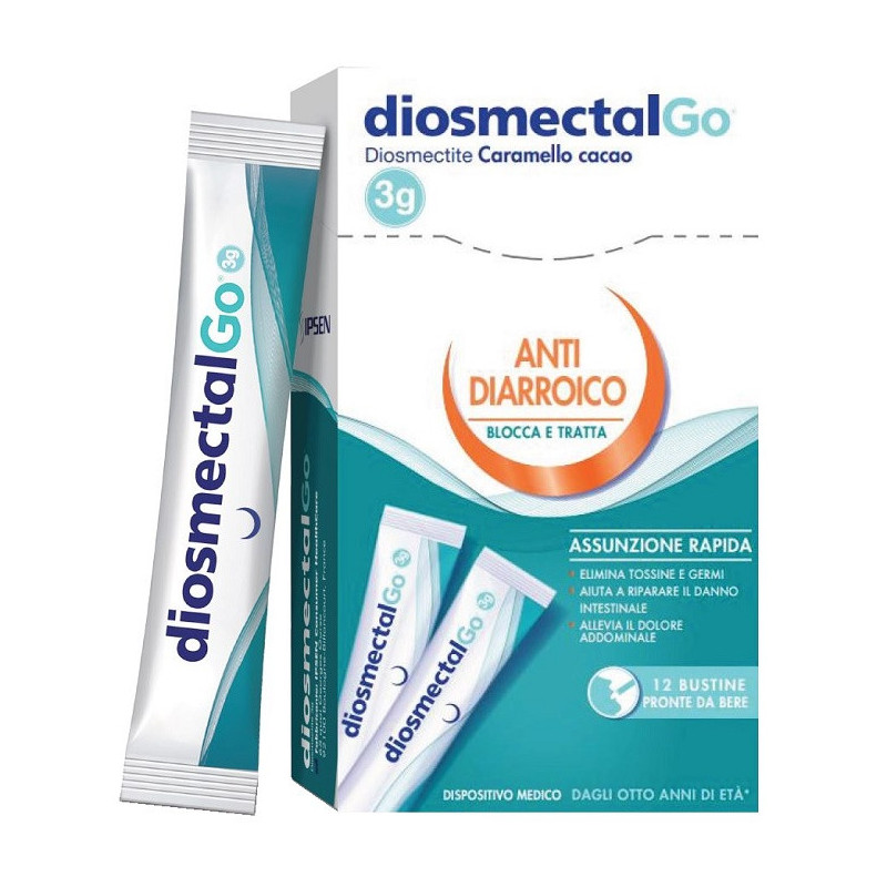 Descrizione Dispositivo medico. Il componente principale di diosmectalGo è diosmectite. Diosmectite è un’argilla naturale che aiuta a bloccare e a trattare la diarrea e ad alleviare il dolore addominale. È stato dimostrato che: - si lega a tossine e germi ed aiuta ad eliminarli dal corpo - protegge il tratto intestinale ed aiuta a riparare il danno intestinale. La diosmectite fornisce un sollievo efficace e riduce i sintomi associati alla diarrea.