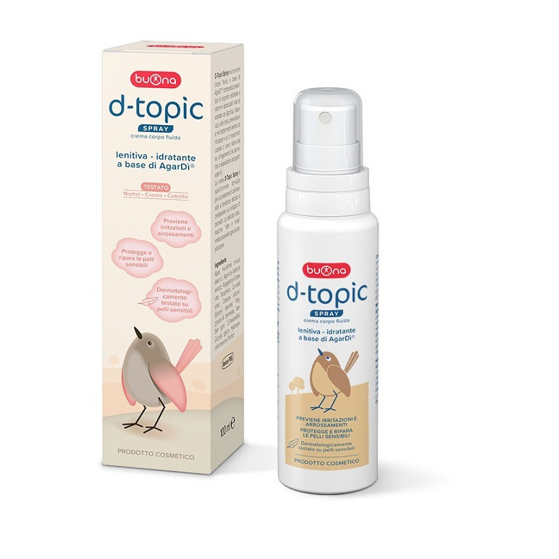 D-Topic spray è utile nella prevenzione e nel trattamento lenitivo di irritazioni e di arrossamenti cutanei di varia natura (ad esempio sfregamento da pannolino o esposizione ad agenti esterni).