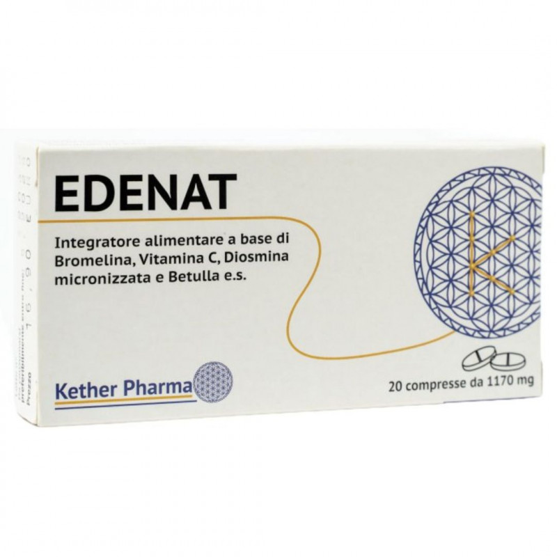 Edenat è un complemento alimentare a base di bromelina, diosmina e betulla. Edenat grazie alla bromelina ed alla betulla ha un effetto fisiologico sul drenaggio dei liquidi corporei. Edenat grazie alla Vitamina C contribuisce alla normale formazione del collagene per la normale funzione dei vasi sanguigni.