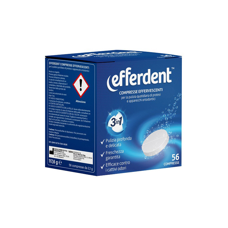 Efferdent Compresse Effervescenti per la pulizia quotidiana di protesi dentali, ponti mobili e apparecchi ortodontici garantisce: pulizia profonda e delicata, freschezza ed efficacia contro i cattivi odori.