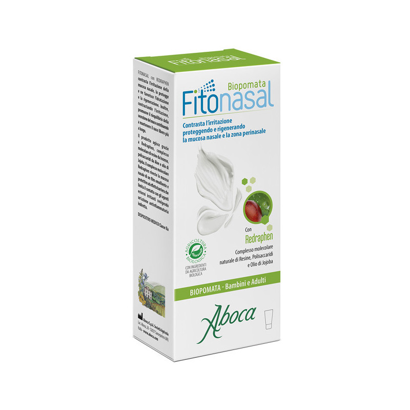 Descrizione Fitonasal con Redraphen è un dispositivo medico innovativo che, rivestendo la mucosa nasale di un film emolliente e protettivo ad effetto barriera, limita il contatto con gli agenti esterni irritanti svolgendo così un'azione antinfiammatoria indiretta. Il prodotto, formulato con ingredienti da agricoltura biologica, agisce grazie a Redraphen, complesso molecolare naturale di resine da Incenso e polisaccaridi da Aloe uniti all'olio di Jojoba. Azione specifica in caso di rinorrea: -Fitonasal con Redraphen contrasta l'irritazione della mucosa e contribuisce a mantenere il naso libero più a lungo, promuovendo il riequilibrio della secrezione del muco. Fitonasal Con Redraphen può esplicare la sua massima efficacia se applicato dopo opportuna pulizia del naso e in particolare nei bambini dopo lavaggio con soluzioni nasali. -Fitonasal con Redraphen favorisce la guarigione, previene e attenua le irritazioni e le screpolature della mucosa e della cute esterna del naso: applicato sulla zona perinasale idrata e contrasta l'irritazione facilitando il risanamento di abrasioni e screpolature che si verificano a causa dell'essiccazione del muco e dei frequenti strofinamenti. Azione specifica su secchezza e atrofia: -Fitonasal con Redraphen protegge la mucosa e la cute perinasale, ne favorisce la rigenerazione e promuove il ripristino dell'equilibrio idro-lipidico dei tessuti. Fitonasal con Redraphen facilita la rimozione delle croste, anche a seguito di interventi chirurgici. -Fitonasal con Redraphen usato in prevenzione, nelle condizioni che possono provocare secchezza, previene la disidratazione e protegge la mucosa e la cute perinasale. Può essere utile anche prima di intraprendere attività sportive prolungate. Il prodotto non contiene eucaliptolo e mentolo. Fitonasal con Redraphen dona inoltre una piacevole sensazione di freschezza. Indicazioni: Fitonasal con Redraphen è indicato in tutti i casi in cui la mucosa nasale è irritata: -Rinorrea (naso che cola), dovuta a raffreddore e a varie forme di riniti acute e croniche. -Secchezza e atrofia della mucosa nasale dovuta a: condizioni patologiche acute e croniche (quali sinusite, rinite allergica, rinite vasomotoria); trattamenti farmacologici (quali decongestionanti, cortisonici, antistaminici, in particolare se applicati in forma di spray e aerosol); contatto con agenti esterni irritanti (quali polvere, fumo, smog, pollini o microrganismi). -In prevenzione, nelle condizioni che possono provocare secchezza e prima di intraprendere attività sportive prolungate. Fitonasal con Redraphen è anche indicato nei casi di irritazione, screpolature e abrasioni della cute delle narici e della zona perinasale. Fitonasal con Redraphen è stato appositamente studiato per consentirne l'uso a partire dal sesto mese di vita. Il prodotto è formulato con ingredienti da agricoltura biologica e non contiene eucaliptolo e mentolo. Il prodotto può essere utilizzato anche per periodi prolungati.