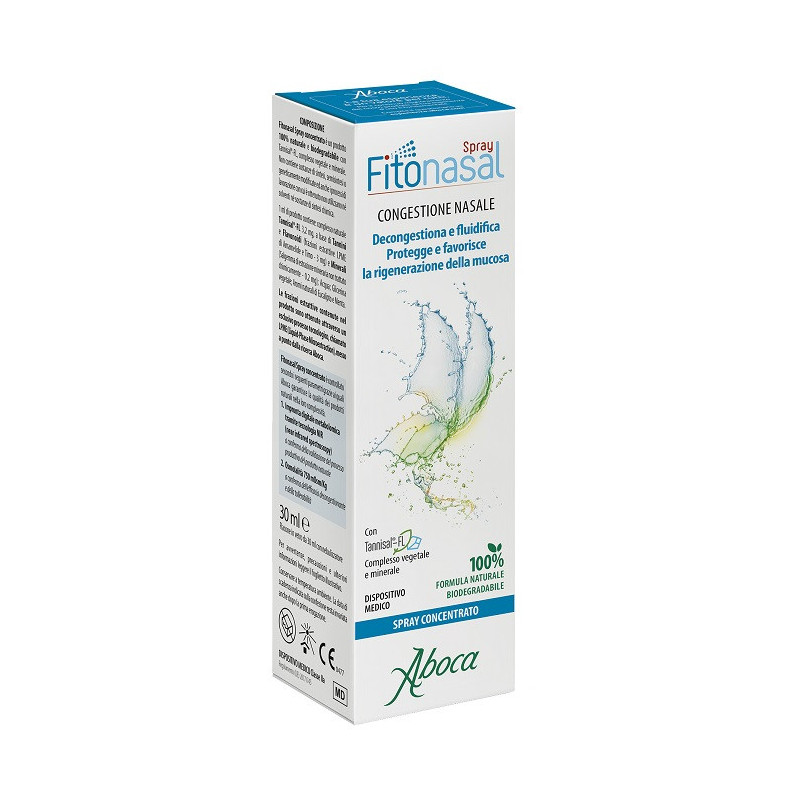 Componenti Fitonasal spray concentrato è un prodotto 100% naturale e biodegradabile con Tannisal-FL, complesso vegetale e minerale. Non contiene sostanze di sintesi, semisintesi o geneticamente modificate ed anche i processi di lavorazione con cui è ottenuto non utilizzano né solventi né sostanze di sintesi chimica. 1 ml di prodotto contiene: complesso naturale Tannisal-FL 3,2 mg, a base di tannini e flavonoidi (frazioni estrattive LPME di amamelide e timo - 3 mg) e minerali (salgemma di estrazione mineraria non trattato chimicamente - 0,2 mg); acqua; glicerina vegetale; aromi naturali di eucalipto e menta.