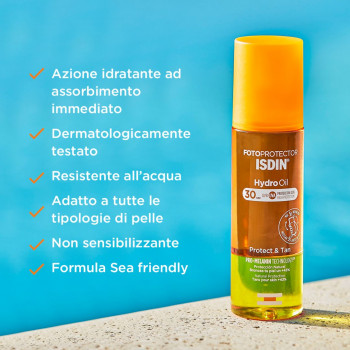 Isdin Photoprotector Hydro Oil SPF30 è il primo fotoprotettore bifasico con SPF30 che protegge la pelle e aumenta del 43% l'abbronzatura grazie all'innovativa tecnologia Pro-Melanin TechnologyTM.