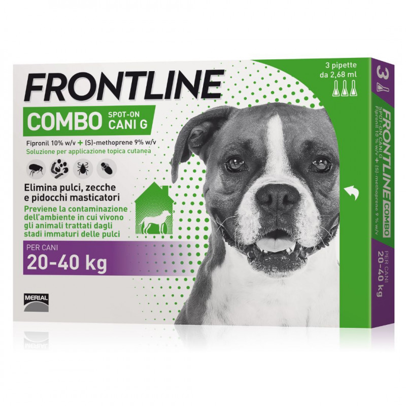 Le pipette Spot-On Frontline Combo per cani grandi è una soluzione insetticida per applicazione topica cutanea che elimina zecche, pulci e pidocchi masticatori.