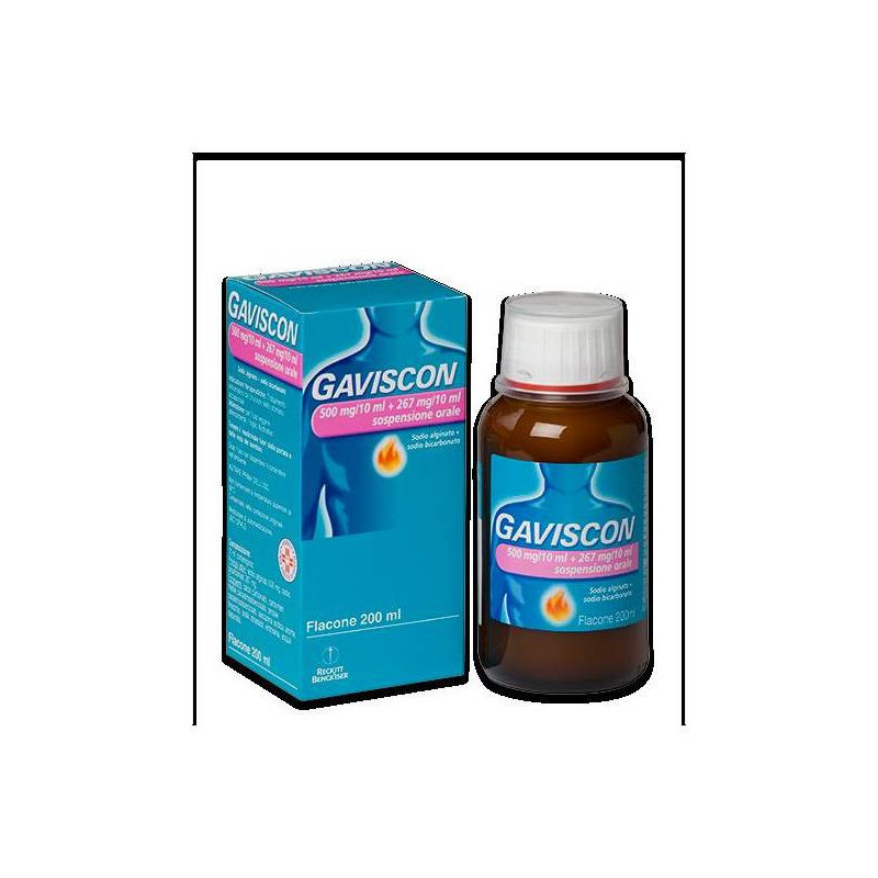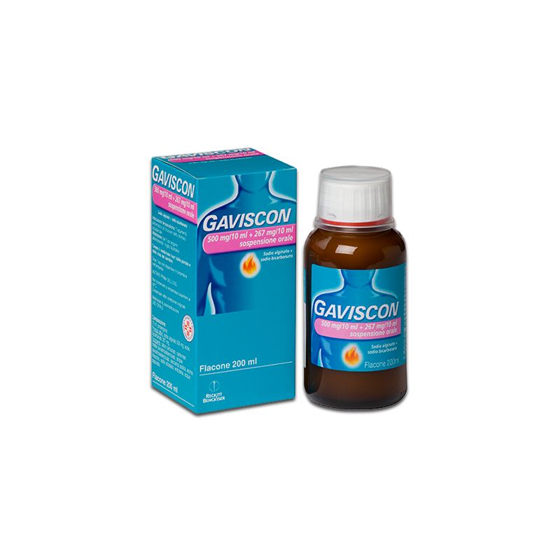 Gaviscon 500 mg + 267 mg compresse masticabili gusto menta. Una compressa contiene: Principi attivi: sodio alginato 500 mg; sodio bicarbonato 267 mg. Eccipiente con effetti noti: aspartame 7,5 mg sodio 126,5 mg Gaviscon 250 mg + 133,5 mg compresse masticabili gusto menta. Una compressa contiene: Principi attivi: sodio alginato 250 mg; sodio bicarbonato 133,5 mg. Eccipiente con effetti noti: aspartame 3,75 mg sodio 63,25 mg Gaviscon 250 mg + 133,5 mg compresse masticabili gusto fragola. Una compressa contiene: Principi attivi: sodio alginato 250 mg, sodio bicarbonato 133,5 mg. Eccipiente con effetti noti: aspartame 8,80 mg sodio 63,25 mg Gaviscon 500 mg/10 ml + 267 mg/10 ml sospensione orale . 10 ml contengono: Principi attivi: sodio alginato 500 mg; sodio bicarbonato 267 mg. Eccipienti con effetti noti: metile paraidrossibenzoato 40 mg propile paraidrossibenzoato 6 mg alcol benzilico 1,1 mg sodio 142,6 mg Gaviscon 500 mg/10 ml + 267 mg/10 ml sospensione orale aroma menta. 10 ml contengono: Principi attivi: sodio alginato 500 mg; sodio bicarbonato 267 mg. Eccipienti con effetti noti: metile paraidrossibenzoato 40 mg propile paraidrossibenzoato 6 mg sodio 142,6 mg Per l’elenco completo degli eccipienti, vedere paragrafo 6.1.