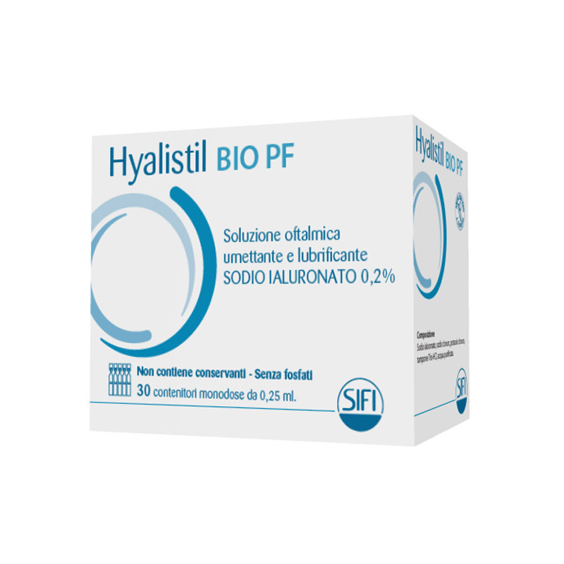 Avvertenze Per esclusivo uso topico oculare. Tenere fuori dalla portata dei bambini. Non utilizzare Hyalistil BIO PF se il contenitore è aperto o danneggiato. Non toccare l’estremità del contenitore aperto e non metterla a diretto contatto con l’occhio. Ciascun contenitore monodose va usato solo immediatamente dopo l’apertura. L’eventuale residuo non deve essere riutilizzato, poiché Hyalistil BIO PF non contiene conservanti e il prodotto rimanente potrebbe contaminarsi esponendo al rischio di infezioni oculari. Non utilizzare Hyalistil BIO PF dopo la data di scadenza. Non disperdere il prodotto nell’ambiente dopo l’uso. La somministrazione di Hyalistil BIO PF a bambini o persone con abilità limitata deve essere effettuata da parte di un adulto responsabile. Non sono note interazioni del prodotto con la somministrazione di farmaci per uso oftalmico. Tuttavia, si consiglia di non somministrare altri farmaci o dispositivi medici per uso oftalmico nei 10 minuti successivi alla somministrazione di Hyalistil BIO PF. Non è necessario rimuovere le lenti a contatto prima della somministrazione di Hyalistil BIO PF poiché il prodotto non altera le caratteristiche fisiche, inclusa la trasparenza, delle più diffuse lenti a contatto morbide e rigide. L’uso del prodotto può causare occasionalmente intolleranza (lieve bruciore o irritazione).