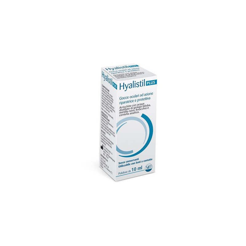 Soluzione sterile per uso oftalmico con un pH fisiologico, contenente sodio ialuronato e acque distillate di ginkgo biloba, mirtillo, finocchio e centella asiatica. Il sodio ialuronato conferisce al dispositivo medico proprietà mucomimetiche e visco-elastiche in modo da garantire un'adeguata lubrificazione della superficie oculare, proteggendola dall’attrito generato dai movimenti oculari. Inoltre, il polimero è in grado di trattenere l'acqua: per questo motivo la soluzione è in grado di mantenere umidificata la superficie oculare e aumentare la stabilità del film lacrimale, proteggendo la mucosa oculare dagli agenti esterni. Il ginkgo biloba migliora la visibilità a distanze elevate, allevia la stanchezza e l’arrossamento degli occhi e delle mucose oculari. Tale pianta, insieme con la centella asiatica, sono utilizzate in quanto particolarmente utili nel coadiuvare i processi di riduzione delle irritazioni. Il mirtillo nel contesto della formulazione è utilizzato per le sue proprietà rinfrescanti: dà sollievo agli occhi stanchi e funge da protezione per la mucosa oculare contro gli agenti atmosferici e contro i fattori ambientali. Il finocchio viene utilizzato nei disordini oculari per lenire la sensazione di bruciore e, insieme con il mirtillo, sono utilizzate per la loro azione riparatrice. Tali piante utilizzate sotto forma di acque distillate, nel contesto della formulazione esplicano un’azione lenitiva, rinfrescante e protettiva. La soluzione contiene acido borico e sodio tetraborato decaidrato, come sistema tampone, e sodio cloruro così da garantire una soluzione fisiologica. Pertanto, Hyalistil PLUS svolge un'azione idratante e lubrificante per la superficie oculare e dà un temporaneo sollievo al bruciore, all’irritazione ed ai disagi correlati alla secchezza oculare. Inoltre possono essere utilizzate come protezione per irritazioni dovute ad altri fattori. Può esser utilizzato con lenti a contatto, senza necessità di rimuoverle. Senza conservanti.