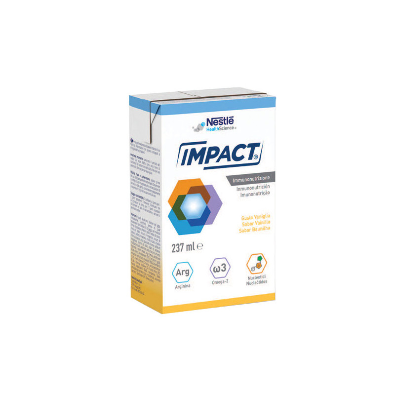 Formato Impact Oral è disponibile in pratica confezione tripack, contenente 3 brick da 237 ml, corrispondenti al dosaggio giornaliero della terapia immuno-nutrizionale preoperatoria.