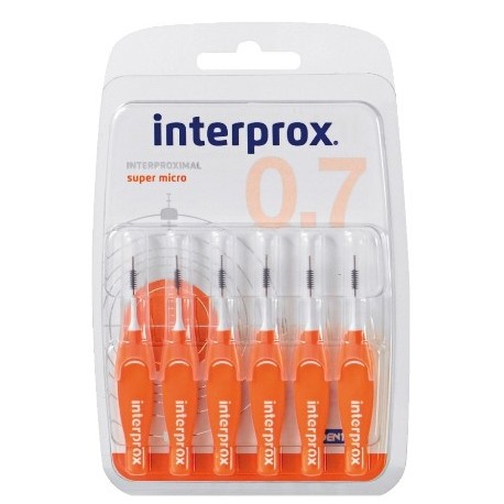 Progettato per eliminare il biofilm orale (placca dentale) che si accumula in spazi interprossimali di 0,7 mm ed è particolarmente indicato per i denti anteriori. La sua forma consente di raggiungere perpendicolarmente gli spazi interprossimali anteriori, evitando di danneggiare le gengive. Lo spazzolino può essere allungato unendo il cappuccio al manico, in modo da raggiungere le aree posteriori della bocca. Inoltre, per mantenere l'entrata perpendicolare in queste zone, lo spazzolino si adatta a ogni persona grazie alla flessibilità senza "effetto memoria" del manico e del collo. Tra le altre cose, Interprox® Super Micro è dotato di un inserto antiscivolo per migliorare la presa e il controllo, garantendo la praticità e la precisione della pulizia. La dimensione della testina raggiunge spazi interprossimali di almeno 0,7 mm (PHD=0,7). L'innovativa fabbricazione con filamenti in Tynex® di alta qualità consente una migliore cura delle gengive, dato che il design bicolore consente il rilevamento dei punti di sanguinamento sui filamenti bianchi e della presenza di biofilm interdentale su quelli neri. Il filo metallico, in acciaio inossidabile, è rivestito con poliuretano (materiale plastico) per una migliore protezione di gengive, denti e impianti. Lo spazzolino, inoltre, dispone di un cappuccio di protezione che ne facilita il trasporto. Interprox® Super Micro pulisce efficacemente gli spazi interprossimali e contribuisce a proteggere i denti dalle carie e dalle malattie parodontali. Interprox® Super Micro soddisfa la normativa ISO 16409 (norma internazionale per gli spazzolini interprossimali).