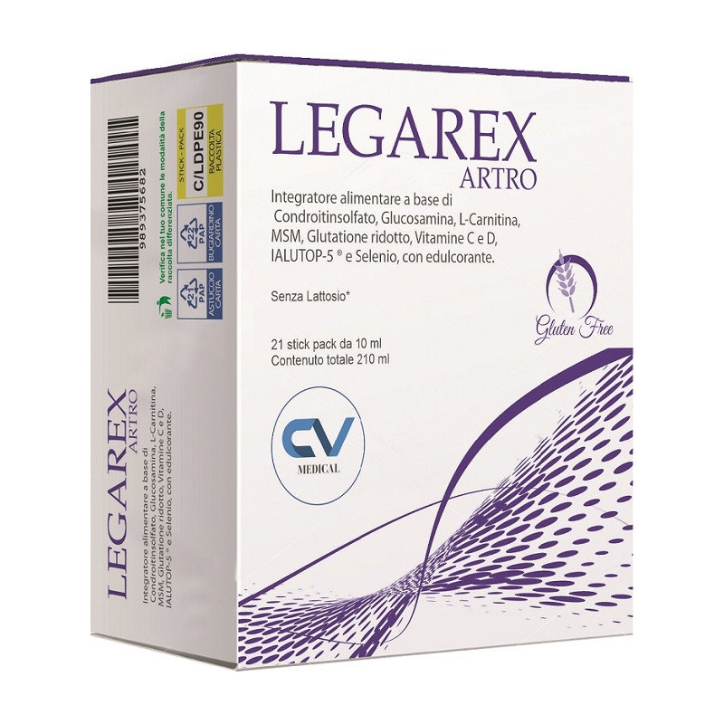 integratore alimentare a base di Condroitinsolfato, glucosamina, L-carnitina, MSM, Glutatione ridotto, vitamine C e D, IALUTOP-5 (acido ialuronico, miscela di 5 diversi pesi molecolari) e selenio. La vitamina C contribuisce alla normale formazione del collagene per la normale funzione delle ossa e delle cartilagini e, insieme al Selenio, alla protezione delle cellule dallo stress ossidativo. La vitamina D contribuisce al normale assorbimento/utilizzo del calcio e del fosforo, a normali livelli di calcio nel sangue e al mantenimento di ossa normali.