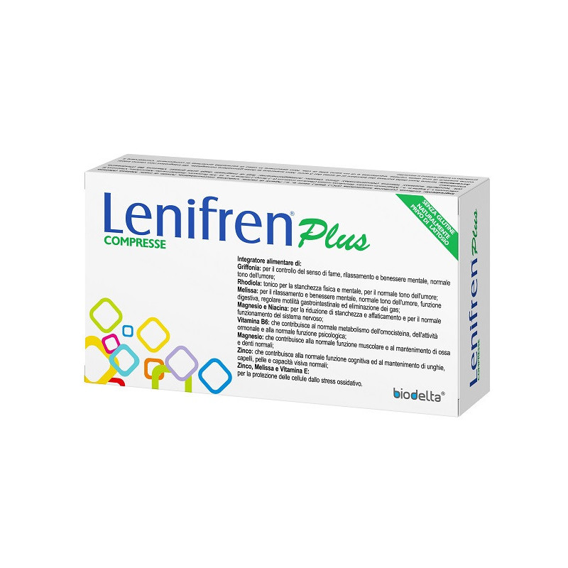 Descrizione Integratore alimentare a base di fitoestratti, vitamine e minerali: griffonia per il controllo del senso di fame, rilassamento e benessere mentale, normale tono dell'umore; rhodiola tonico per la stanchezza fisica e mentale, per il normale tono dell'umore; melissa per il rilassamento e benessere mentale, normale tono dell'umore, funzione digestiva, regolare motilità gastrointestinale ed eliminazione dei gas; magnesio e niacina per la riduzione di stanchezza e affaticamento e per il normale funzionamento del sistema nervoso; vitamina B6 che contribuisce al normale metabolismo dell'omocisteina, dell'attività ormonale e alla normale funzione psicologica; magnesio che contribuisce alla normale funzione muscolare e al mantenimento di ossa e denti normali; zinco che contribuisce alla normale funzione cognitiva ed al mantenimento di unghie, capelli, pelle e capacità visiva normali; zinco, melissa e vitamina E per la protezione delle cellule dallo stress ossidativo.