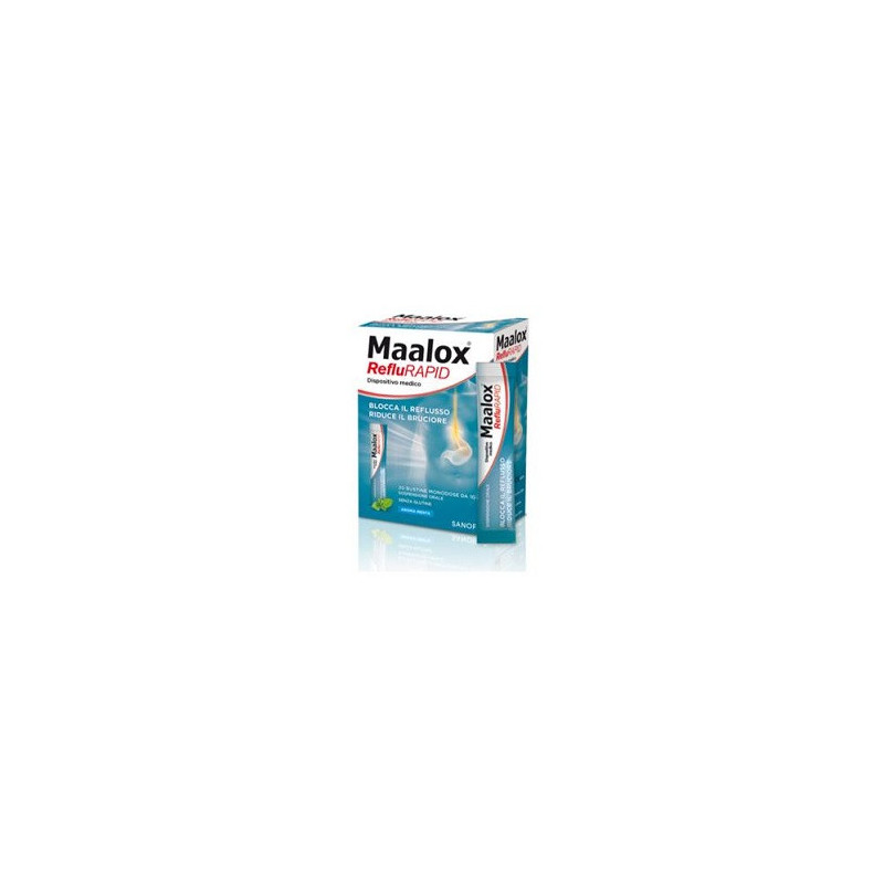Descrizione Dispositivo medico ad azione meccanica a base di sodio alginato, bicarbonato di sodio, sodio carbonato e calcio carbonato, formulato per svolgere 3 azioni sinergiche: bloccare il reflusso acido, ridurre il bruciore e proteggere la mucosa dell’esofago. Maalox RefluRAPID dispositivo medico è indicato per il trattamento del reflusso gastro-esofageo al fine di ridurre i sintomi ad esso correlati, come ad esempio: bruciore, pirosi gastrica in gravidanza, esofagite da reflusso, rigurgito acido, cattiva digestione, sintomi notturni da reflusso, tosse e infiammazione laringo-faringea. Grazie all’azione dell’alginato di sodio e dei carbonati in esso contenuti, può iniziare ad agire in 3 minuti. A contatto con l’acido dello stomaco, l’alginato di sodio reagisce formando un gel mentre i carbonati rilasciano anidride carbonica permettendo al gel di galleggiare e di formare così un tappo che impedisce meccanicamente la risalita dei succhi gastrici verso l’esofago. La presenza del bicarbonato contribuisce inoltre a ridurre l’iperacidità di stomaco. Grazie alle sue peculiari caratteristiche, esplica un effetto barriera che protegge la mucosa dell’esofago dall’aggressione degli acidi, favorendone la rigenerazione e aiutando a prevenire il rischio di ricadute di esofagite da reflusso. La sua formulazione, caratterizzata da uno specifico bilanciamento tra l’alginato di sodio e i carbonati, favorisce una rapida azione.