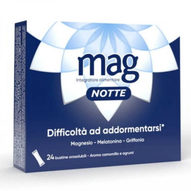 Mag Notte è un integratore alimentare utile per favorire il sonno e il rilassamento mentale. Magnesio, melatonina e griffonia aiutano a dormire bene, favorendo il rilassamento e il benessere mentale. L’effetto benefico si ottiene con l’assunzione, poco prima di coricarsi, di 1 mg di melatonina. Aroma agrumi e camomilla.
