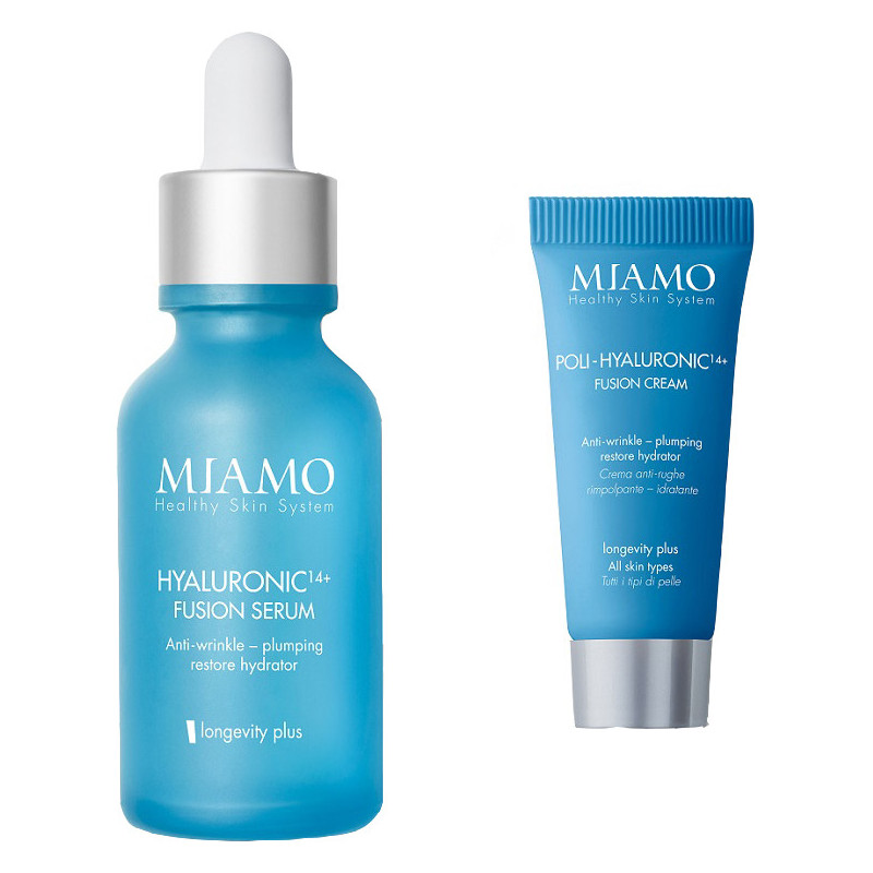 Bundle contenente Hyaluronic14+ fusion serum (30 ml) e Poly-Hyaluronic14+ fusion cream (5 ml).
