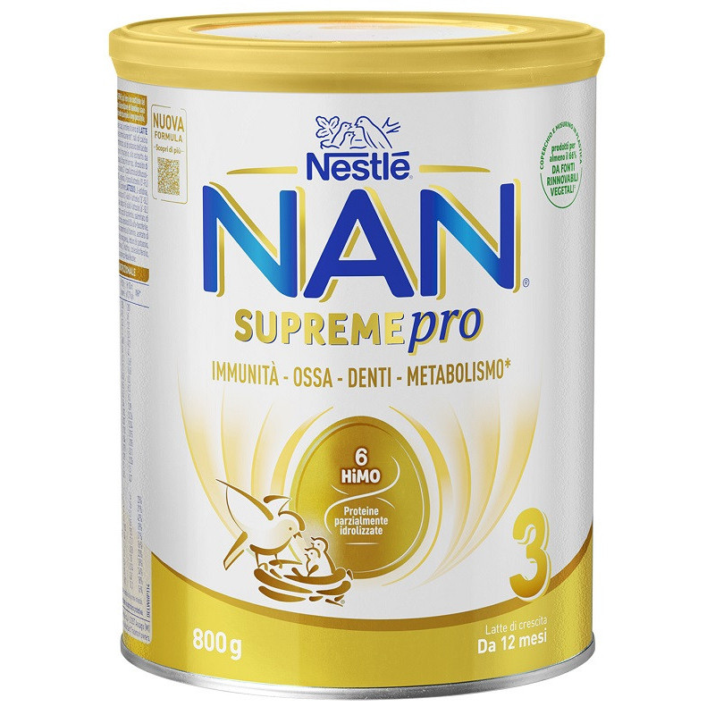 Seguire le istruzioni esattamente. L'uso di acqua e biberon non bolliti, la ricostituzione, la conservazione, la manipolazione, la preparazione e la somministrazione non corretti possono essere causa di rischi per la salute del bambino. NESTLÉ NAN SUPREME pro 3 non è un sostituto del latte materno, ma un latte di crescita idoneo all'alimentazione del bambino sano da 12 mesi in avanti. L'allattamento al seno dovrebbe durare più a lungo possibile.