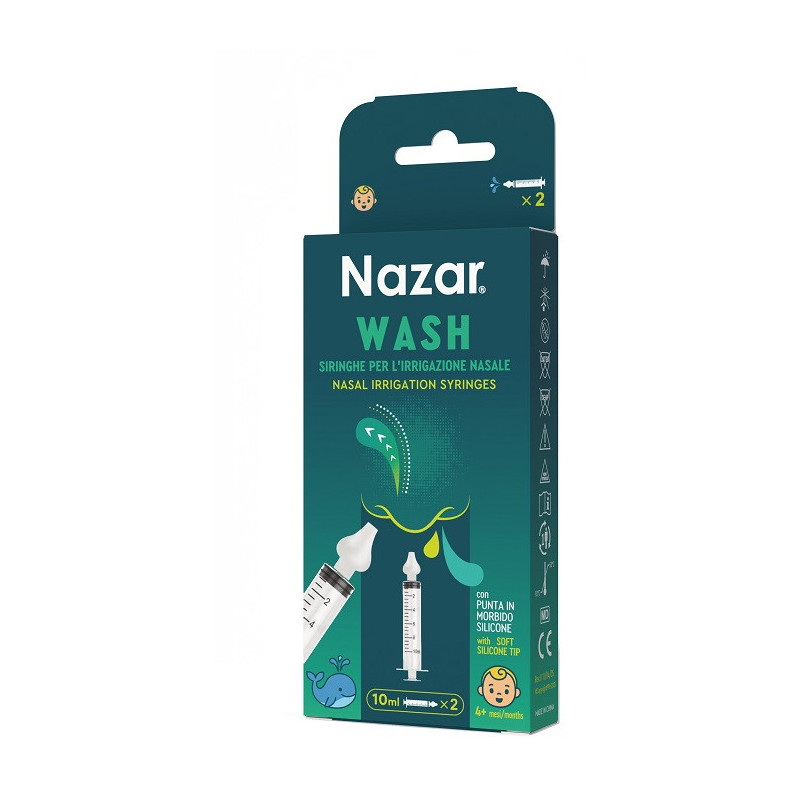 Avvertenze La soluzione fisiologica deve essere a temperatura ambiente. Non utilizzare soluzioni con temperature superiori a 40°C. Non utiliuare Nazar Wash quando una narice è completamente ostruita, in presenza di sanguinamento nasale, in presenza di un'infezione all'orecchio e nei bambini di età inferiore ai 4 mesi. Utilizzare con cautela nei pazienti con malattie mentali o gravi disabilità intellettive. Non utilizzare Nazar Wash in pazienti con danni o anomalie alle cavità nasali o ai seni paranasali. Si raccomanda di non condividere il dispositivo di lavaggio con più persone per evitare infezioni crociate. Utilizzare secondo indicazione del medico/pediatra. Non eseguire l'irrigazione nasale prima di andare a letto o di uscire, poiché la soluzione residua potrebbe fuoriuscire dalla narice 20 minuti dopo l'irrigazione. Tenere fuori dalla portata dei bambini. Nazar Wash contiene piccole parti che potrebbero essere ingerite. Questo prodotto deve essere assemblato e maneggiato esclusivamente da un adulto. Smaltire secondo le normative local i vigenti. Segnalare qualsiasi incidente grave verificatosi in relazione al dispositivo al fabbricante e all'autorità competente dello stato membro di riferimento.