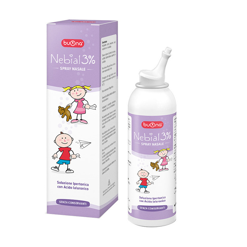 Descrizione Nebial 3% spray nasale è una soluzione salina ipertonica al 3% con aggiunta di acido ialuronico, con azione decongestionante sulle mucose nasali ed effetto fluidificante sul muco. È consigliato per la pulizia quotidiana delle fosse nasali soprattutto in caso di raffreddore, rinite, sinusite e in tutte le situazioni di congestione delle muscose nasali. L’acido ialuronico contenuto in Nebial 3% favorisce l’umidificazione delle fosse nasali e rende più gradevole la soluzione salina.