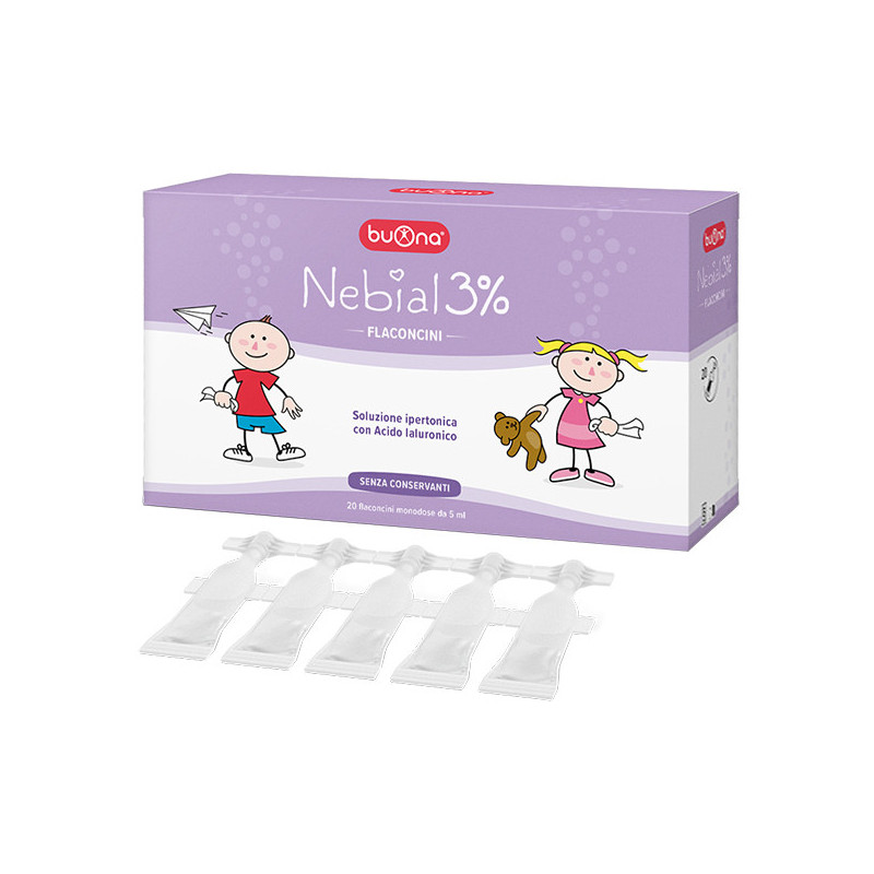 Soluzione salina ipertonica al 3% con aggiunta di acido ialuronico pronta all’uso. Nebial 3% ha un’azione decongestionante sulle mucose nasali oltre ad un effetto fluidificante sul muco. È consigliato per la pulizia quotidiana delle fosse nasali soprattutto in caso di raffreddore, rinite, sinusite e in tutte le situazioni di congestione delle mucose nasali. L’acido ialuronico contenuto in Nebial 3% favorisce l’umidificazione delle fosse nasali e rende più gradevole la soluzione salina. La soluzione contenuta nei flaconcini monodose può essere utilizzata per aerosol terapia.