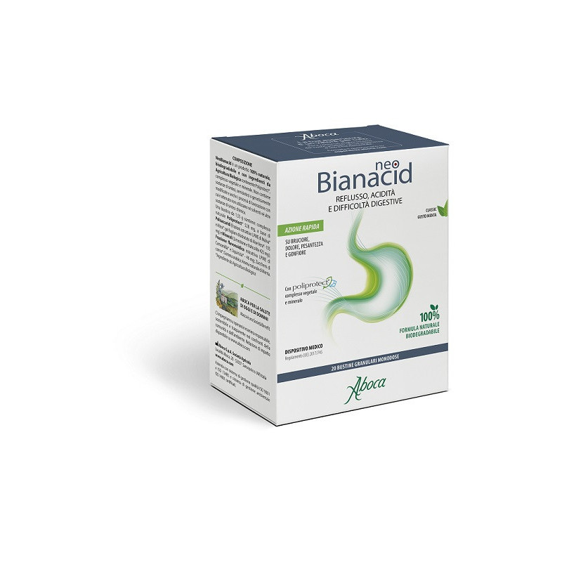 Descrizione Dispositivo Medico CE Classe III. Indicato per il trattamento del reflusso gastroesofageo e del dolore di stomaco (dispepsia dolorosa), caratterizzati da rigurgito acido, bruciore, dolore, tosse irritativa, disfonia. NeoBianacid è indicato anche nel trattamento dei sintomi associati a difficoltà di digestione (dispepsia non dolorosa), quali acidità, pesantezza e gonfiore dopo i pasti, sia ricorrenti che in caso di eccessi alimentari. NeoBianacid può essere utile in prevenzione, nelle situazioni che provocano irritazione della mucosa (ad esempio assunzione di farmaci antinfiammatori o periodi di stress psico-fisico). Il prodotto è adatto anche all’uso in gravidanza, durante l’allattamento e nei bambini sopra i 6 anni.