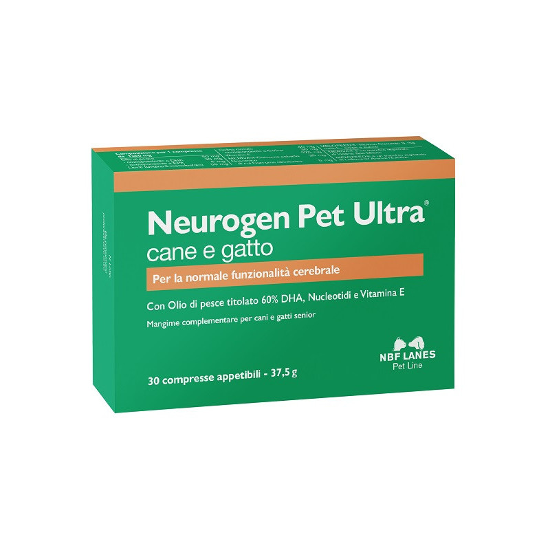 Descrizione Neurogen Pet Ultra è un mangime complementare per cani e gatti anziani formulato con olio di pesce, colina, lieviti, curcuma e vitamina E per la normale funzionalità cerebrale. Per la normale funzionalità cerebrale con olio di pesce titolato 60% DHA, nucleotidi e vitamina E.
