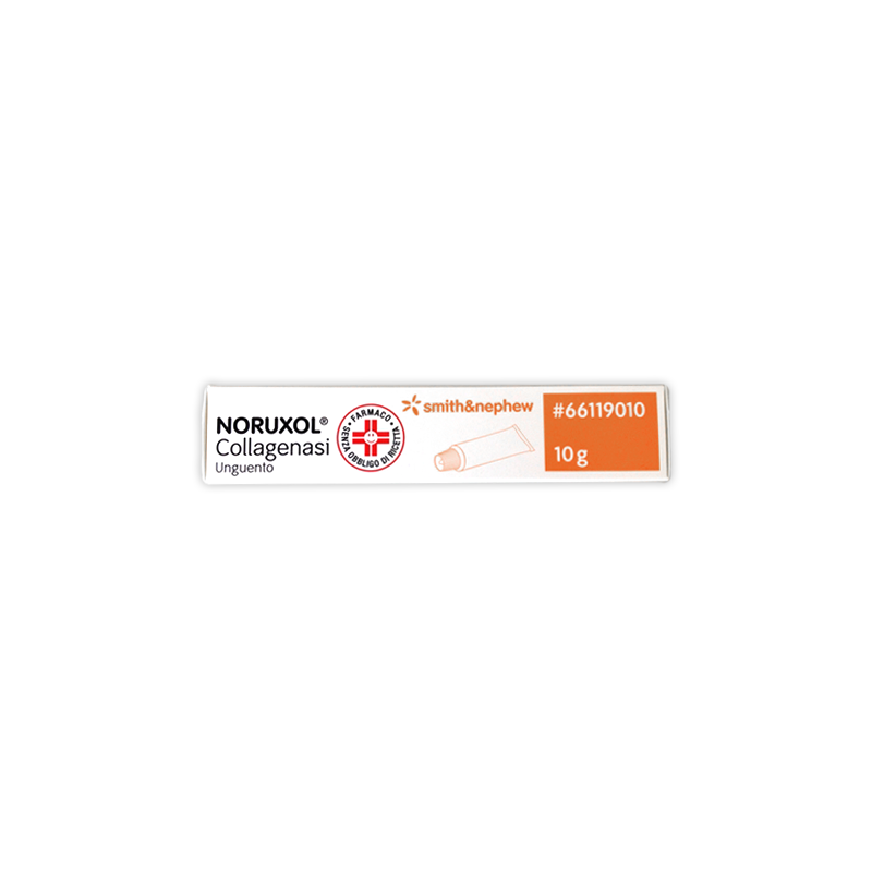 1 g di Noruxol contiene: Principio attivo 0,52 ÷ 3,75 mg di collagenasi N contenente: • Clostridiopeptidasi A non inferiore a 1,2 Unità • Proteasi associate non inferiore a 0,24 Unità Per l’elenco completo degli eccipienti, vedere paragrafo 6.1.
